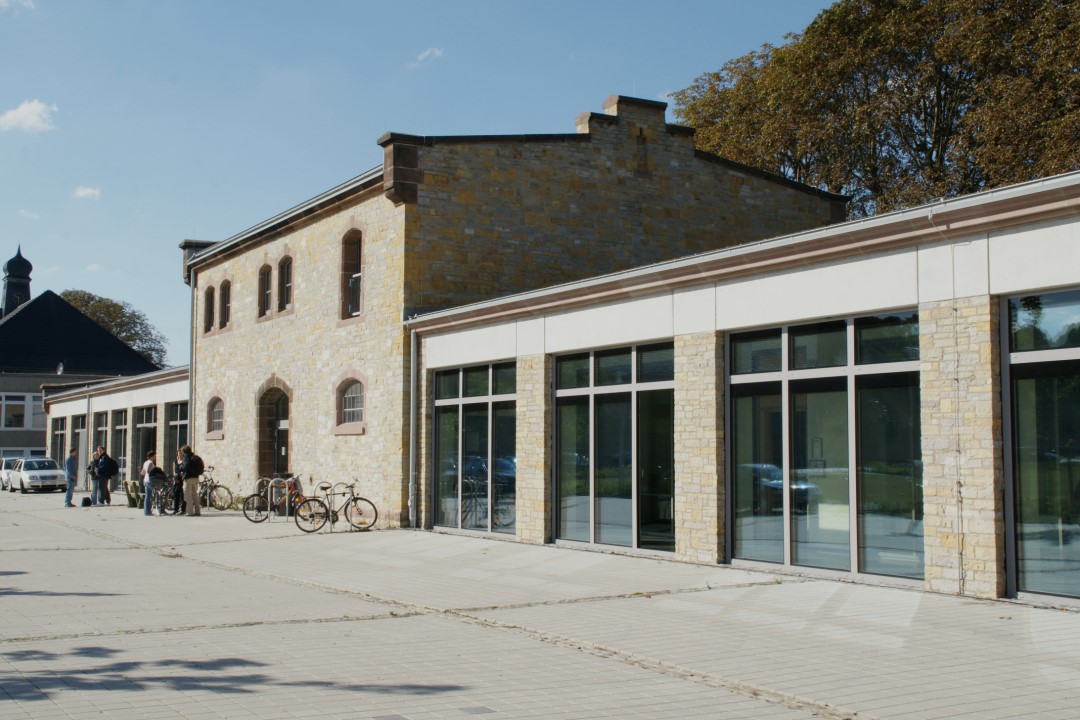 Im Neubau ist ein zentraler offener Innenraum mit Dach-Oberlicht realisiert worden. Die Gestaltung der Fassade des Neubaus wurde mit vorgehängter Keramikfassade in farblicher Anlehnung an die vorhandene Sandsteinfassade des Pferdestalls ausgeführt.